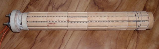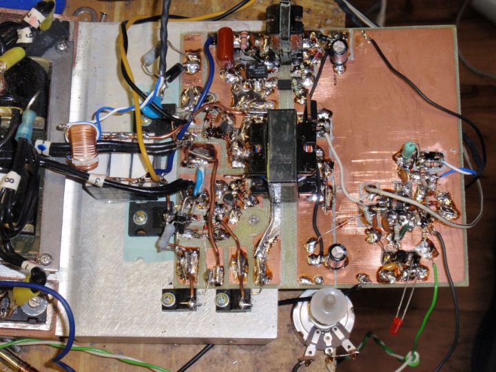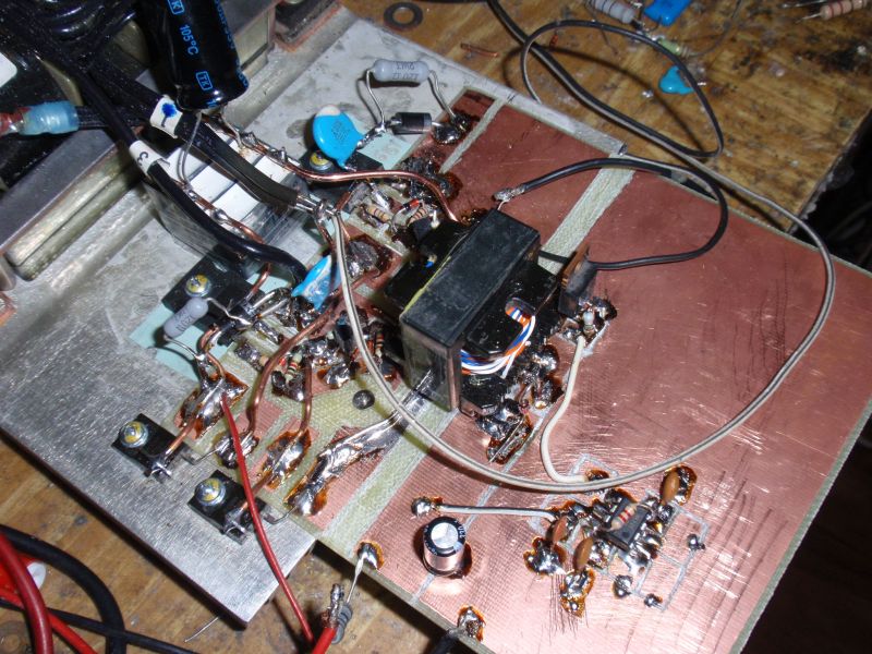 na feritovém jádře EI (může být EE) bez vzduch. mezery z výkonového trafa z PC zdroje ATX, popř. AT. Jádro má průřez stř. sloupku cca 80 - 120mm2.