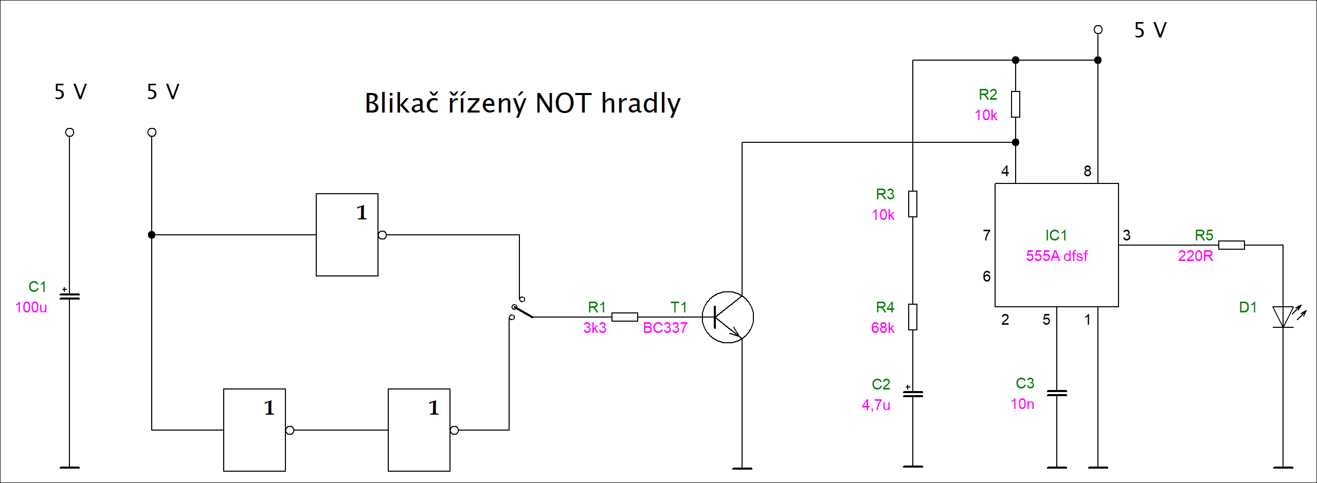 Když je výstup NOT hradla na 5 V, pin 4 je nastaven na log. 0 (kolektor svede napětí do země, čímž 555 nedokáže pracovat, LED nebliká).