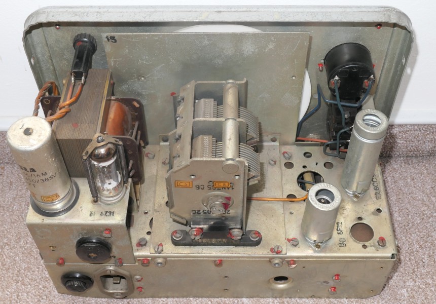 Tesla BM366 - šasi po sejmutí krytů elektronek. Vlevo je vidět zdroj - síťový transformátor, usměrňovací lampu 6Z31 a vyhlazovací kondenzátor 16 + 16 uF.