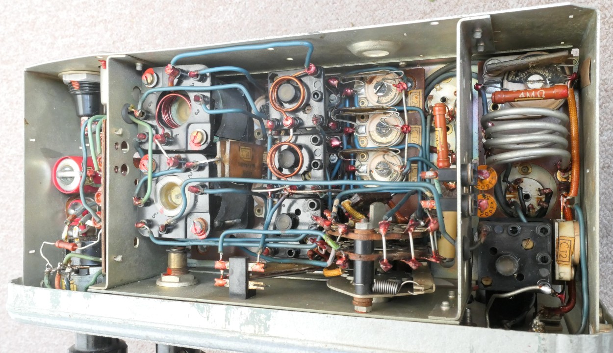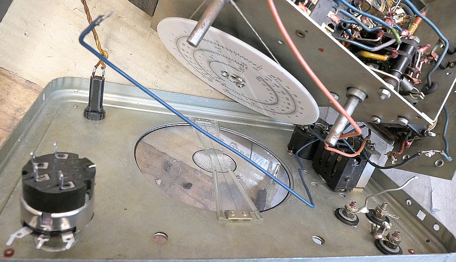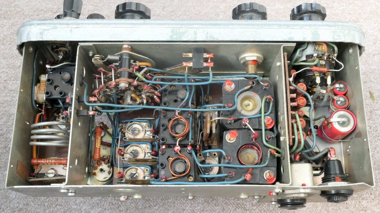 Uprostřed je ladící kondenzátor. Vpravo jsou lampy 6F32 a 6CC31, ručkový přístroj, C9+10 a přepínač L / C.