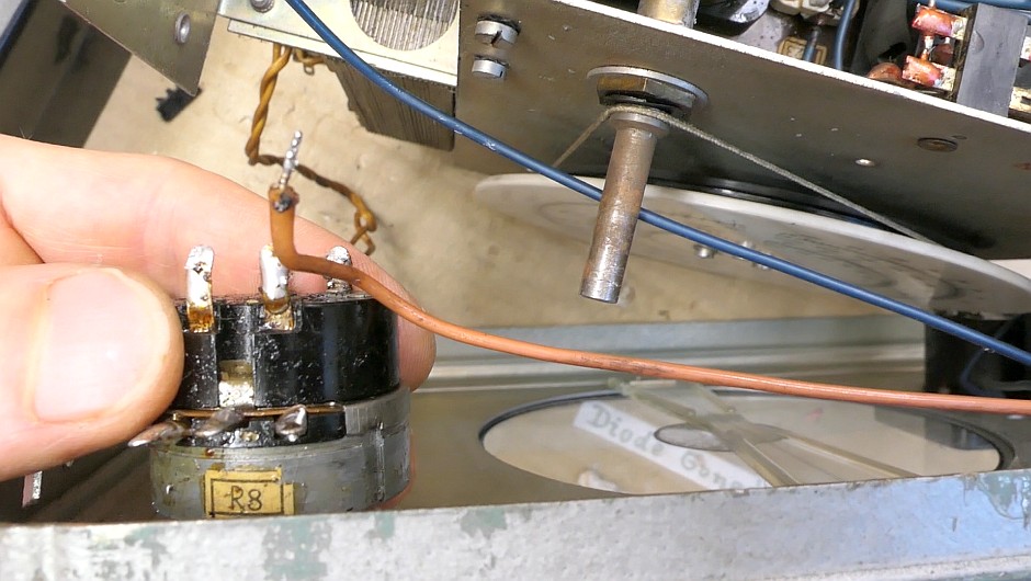 Tesla BM366 - šasi zespodu - detail oblasti u pojistky, vstupu síťového napětí, potenciometru s vypínačem, odrušovacích kondenzátorů, C26 a srážecích odporů.