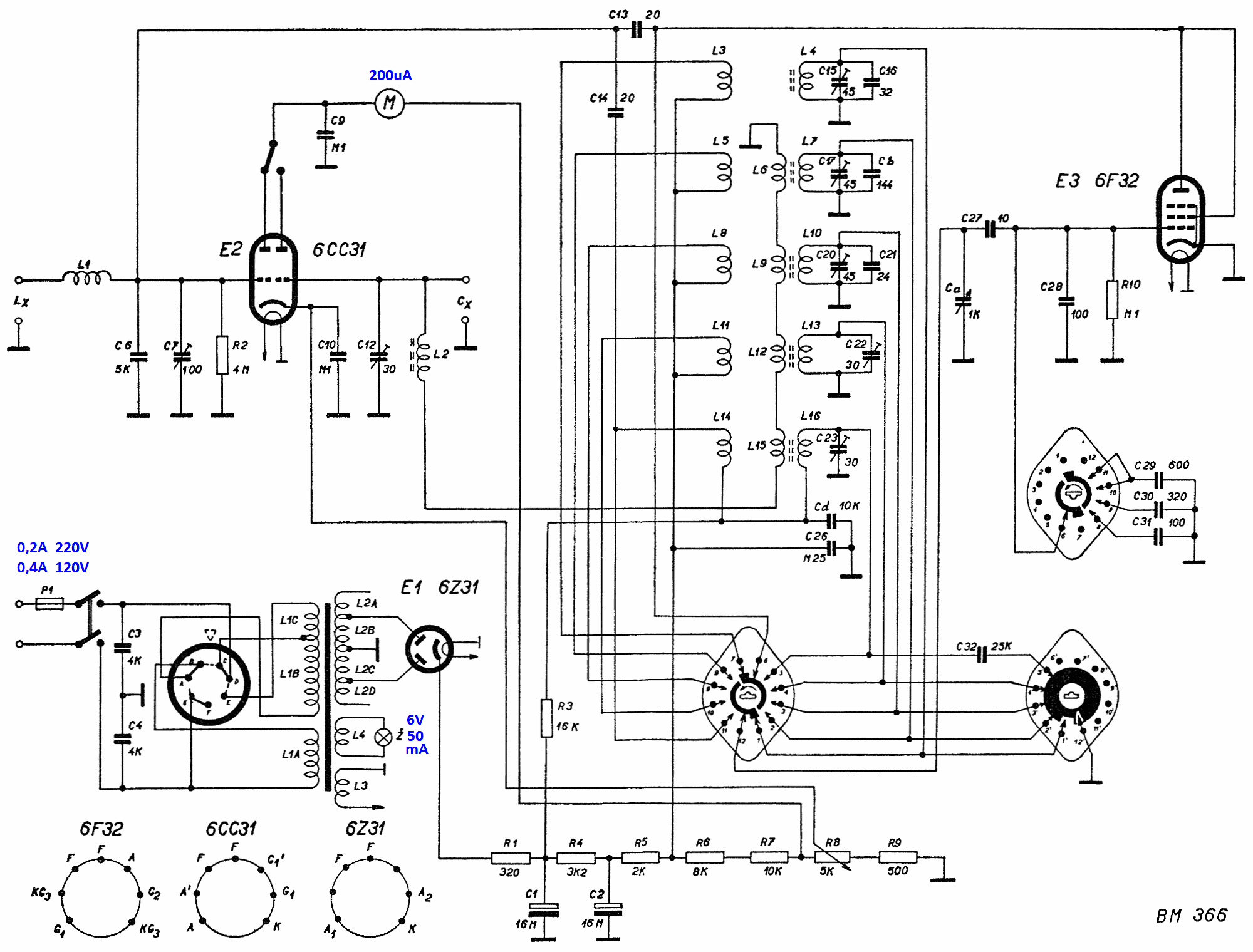 Měřič indukčností a kapacit Tesla BM366 - schéma II (novější verze - hodnoty již z řady E24, na L15 přidán paralelní odpor).