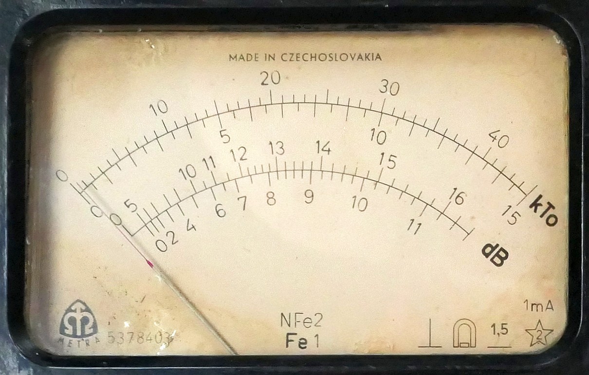 a switch for step regulation and a potentiometer for continuous regulation of noise power, an analog meter calibrated in units of