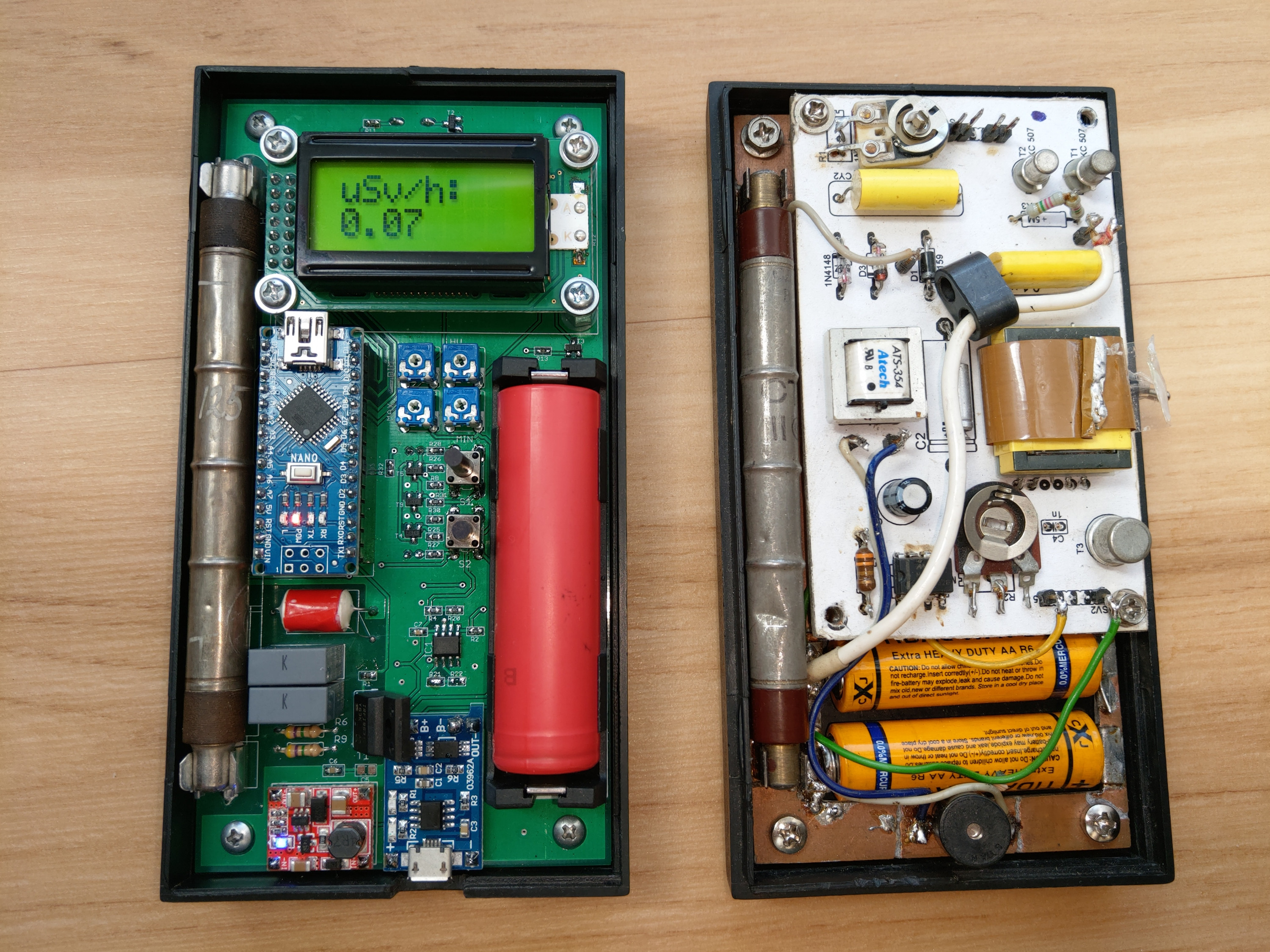 Na to, ze sem to bouchal po nocich asi tyden pred odjezdem do Cernobylu to dopadlo dobre, plosnak vevnitr je samozrejme univerzalni, na to nebyl cas. Zacal sem to delat na Atmega324p, ale pak mi dosla tesne pamet pro zasobnik, tak sem to vymenil za 644. Prog. pameti sem vyuzil asi 40%. Jako zajimavou ficuru tam mam VN zdroj, kery bezi v burst mode cca 10-20ms s pomerne dlouhou periodou nekolik s, kdy to zije z nabityho kondiku, takze prumerna spotreba je nula nic. Mam tam klasicky trafko na CCFL z notaku buzeny jako push-pull tak jak to bylo v puvodni elektornice a zpetna vazba se bere VN delicem na vystupu zdvojovace. Z nakych 3V tak v pohode vyrobim az 1200V, napeti je nastavitelne v menu abych mohl pripadne menit trubice. Data se logujou do 8MB SPI flash a lze k tomu volitelne pripojit GPSka, abych mohl logovat konkretni trasy. Jesi bude nekdy cas, tak se o tom rozepisu vice na webu...